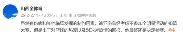 根据山西自媒体的消息,尽管伤病和临场发挥的因素依然存在,但迪亚洛出于对篮球的热爱和对球迷的回报,最终还是决定参赛。这一爆料几乎为他的回归画上了句号。